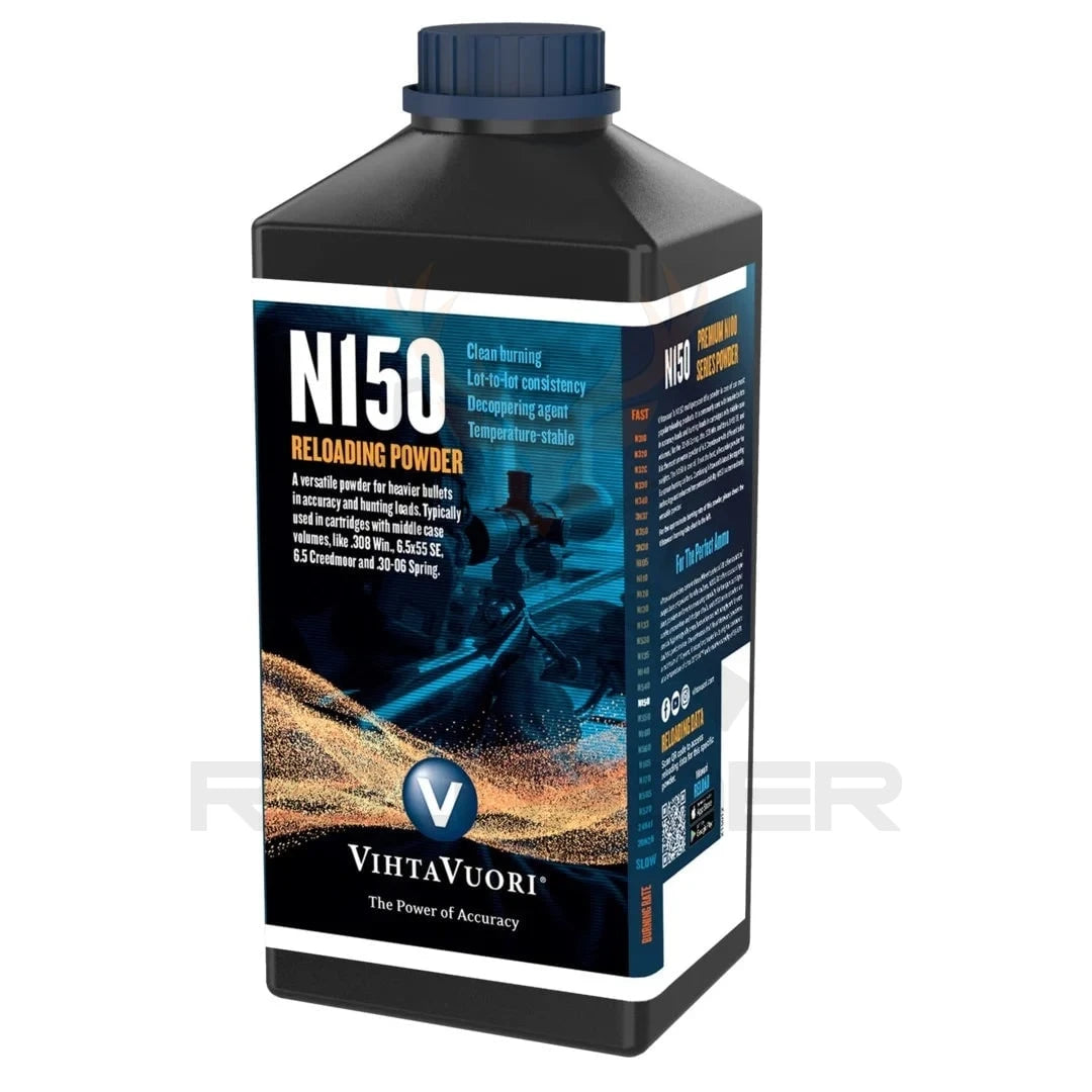 N150 je tubularni tip baruta s dimenzijama zrna približno 1,3 mm duljina × 1,1 mm promjer; gotovo simetričan oblik čini ga dobrim izborom za sve vrste opreme za punjenje. Brzina izgaranja N150 nalazi se u srednjem rasponu naših puščanih prahova. Također je jedan od Vihtavouri baruta najmanje osjetljivih na temperaturu, a zahvaljujući dodatku sredstva za dekupiranje (decoppering agent), nakupljanje bakra u cijevi puške je manje čak i pri uporabi bakrenih projektila.